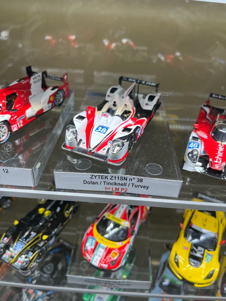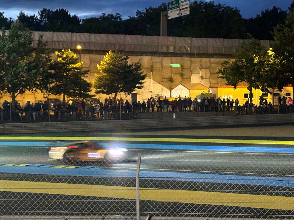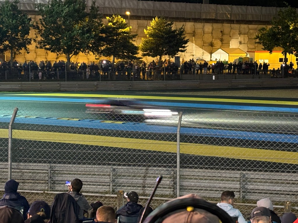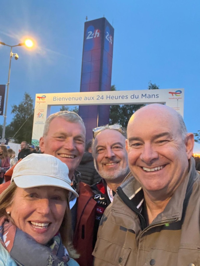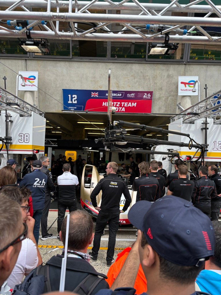 Friday is quiet day on track as the drivers attend a huge parade in old cars in the Le Mans town centre, so we took the opportunity to visit the Le Mans Museum and meet up with Olly for an hour to catch up on all the news from the inside! There was also the opportunity to get out onto the track and into pit lane, which was open to the public. It was just as we were making our way to the pits, that we got a message from Olly to say that Jota had, by the miracle of hard work and determination, had got to the car ready enough to fire up the engine. We quick marched it through the crowds to get there just as the engine roared into life. Huge cheers all round from the crowd and the Jota team. Jota had permission to take the car that night to the neighbouring airfield to give the car a ‘shakedown’, just to make sure everything was working.