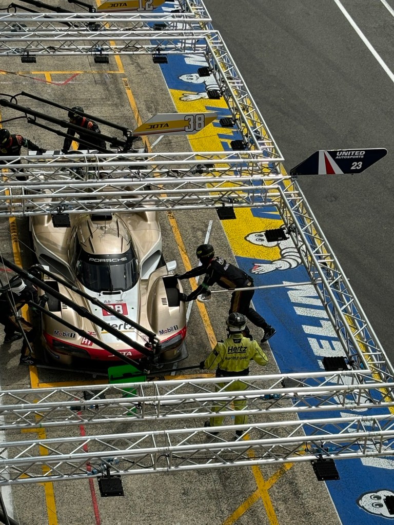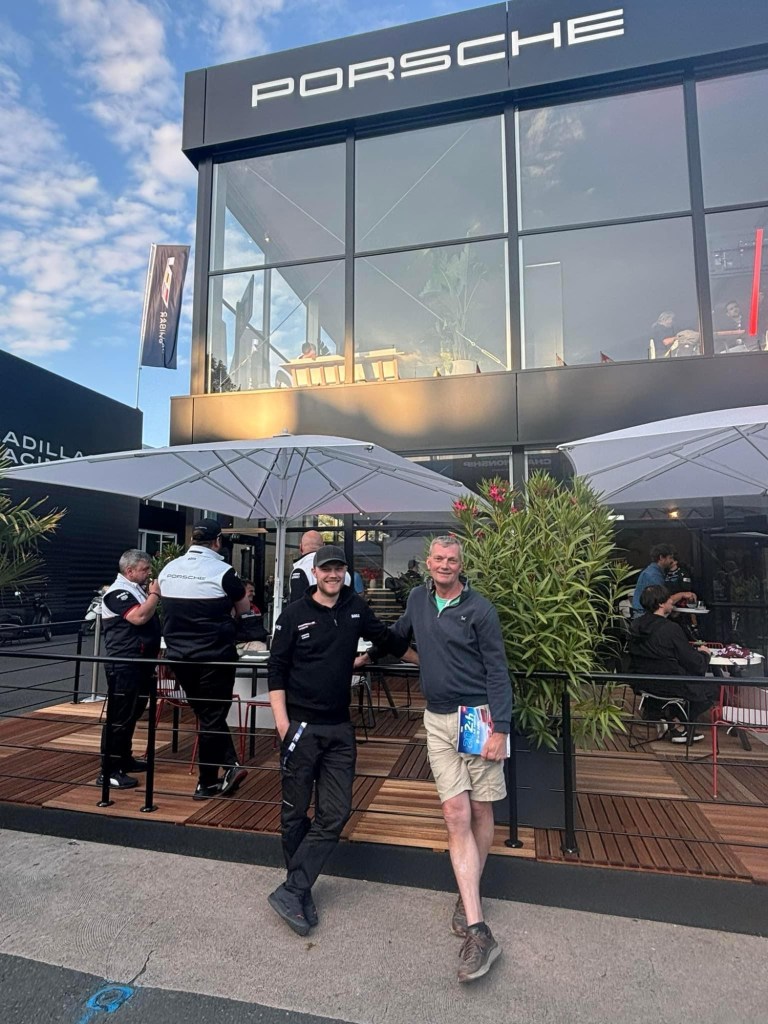 After we set up we took the opportunity to quickly meet up with Olly, our son, a Systems Engineer, who works for Multimatic who provide support to the private teams that run Porsches and Mustangs. At this race he was supporting Hertz Team Jota’s 2 Porsches and Proton Competition’s Porsche. We had a ten minute catch up before that afternoon’s practice sessions got underway. which we watched from the Grandstand above the pits.