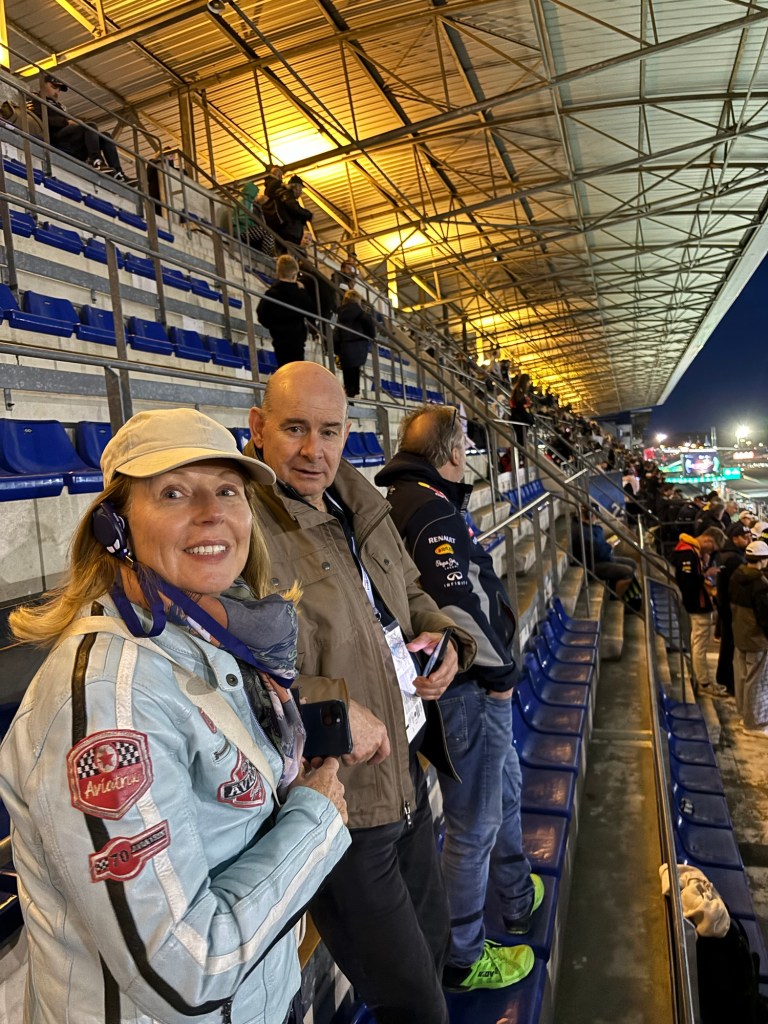 That night we went back into the circuit for a few drinks and then headed back to our camp, for a couple more drinks and late night snack whilst listening to the music coming from the concert area. Trust me, we were close enough to hear and didn’t miss out on anything apart from getting wet, as we sat in our comfy chairs, under the awning out of the rain. We knew Saturday was going to be a long day, so we went to bed sometime after midnight, as the concert was ending, however the campsite had other ideas. The campsite had a couple of competing DJ’s who tried to outdo each other with the bass and volume, plus fireworks, and engines revving. One set of fireworks were set off 3ft from my motorhome windows, they were not bright, sparkly fireworks, they were more like heavy artillery, the ground shook, bits of firework/earth fell on the roof. Paul was watching out of his window and some poor guy in a campervan, shot out of his van looking stunned and dazed as we reckon he was about 1 foot away from the launch zone. Quiet fell over the campsite around 4 am which didn’t last long as the first helicopter hovered overhead around 6 am on its way to the airport. The helicopter was the first of what seemed like a thousand.