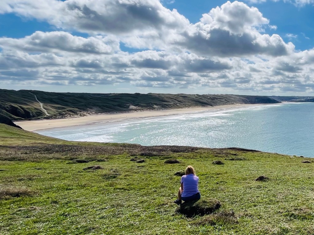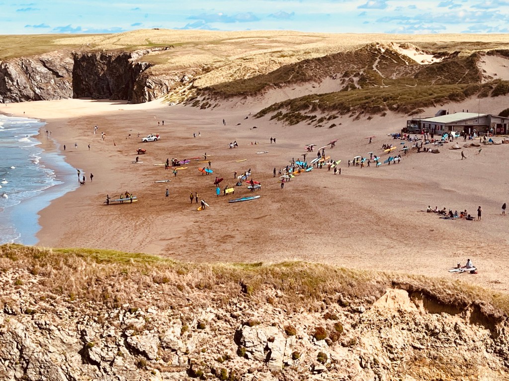 Poly Joke beach is an isolated cove, a good walk from any parking. It is a huge beach when the tide is out, long and relatively narrow. The tide was nearly fully out and there were lots of surfers and body boarders taking advantage of the surf. Charlie went in for a swim but I wasn’t feeling the love so sat on the sand to watch, as despite the sun, I’d come over cold. (By the time we arrived back at the campsite, I had a splitting headache, usually when I feel like this, the headaches last at least 24 hours but frequently around 2-3 days).