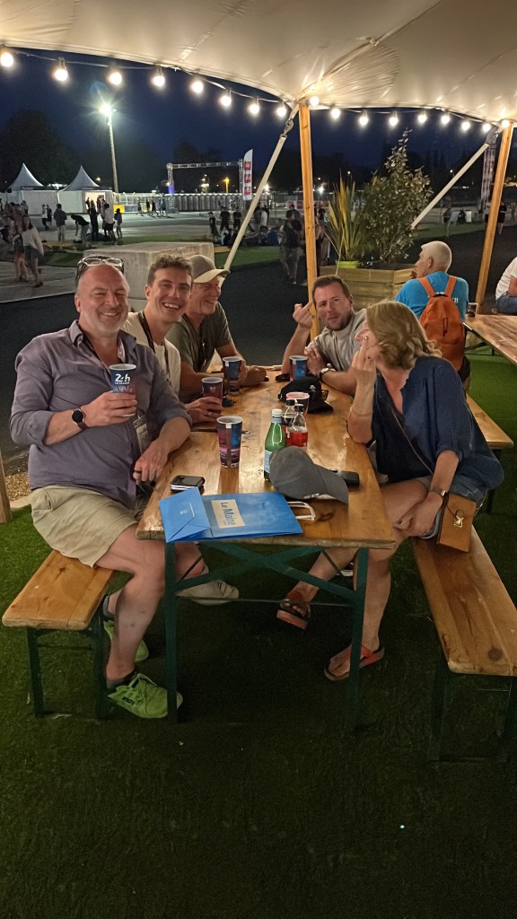 Racing got underway and the first few hours had thrills and spills, with a torrential downpour on one part of the 8-mile circuit, leaving the cars spinning across the track, hitting each other and the Armco. Lots of incidents early on, which meant a lot of safety car laps. Just before sunset we headed back to camp for another fab meal cooked by Clive then headed back to the circuit. Mika was playing the main stage, so most of the group headed to the fan zone whilst we headed to Tertre Rouges and back up through the Essses to watch some of the night racing.