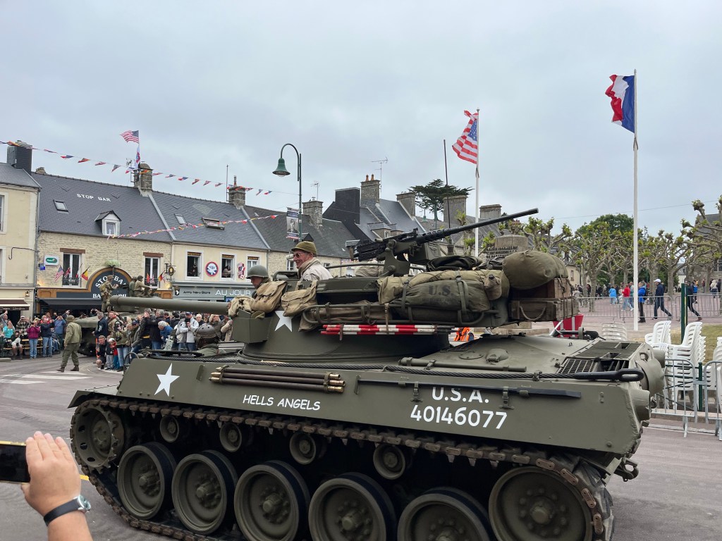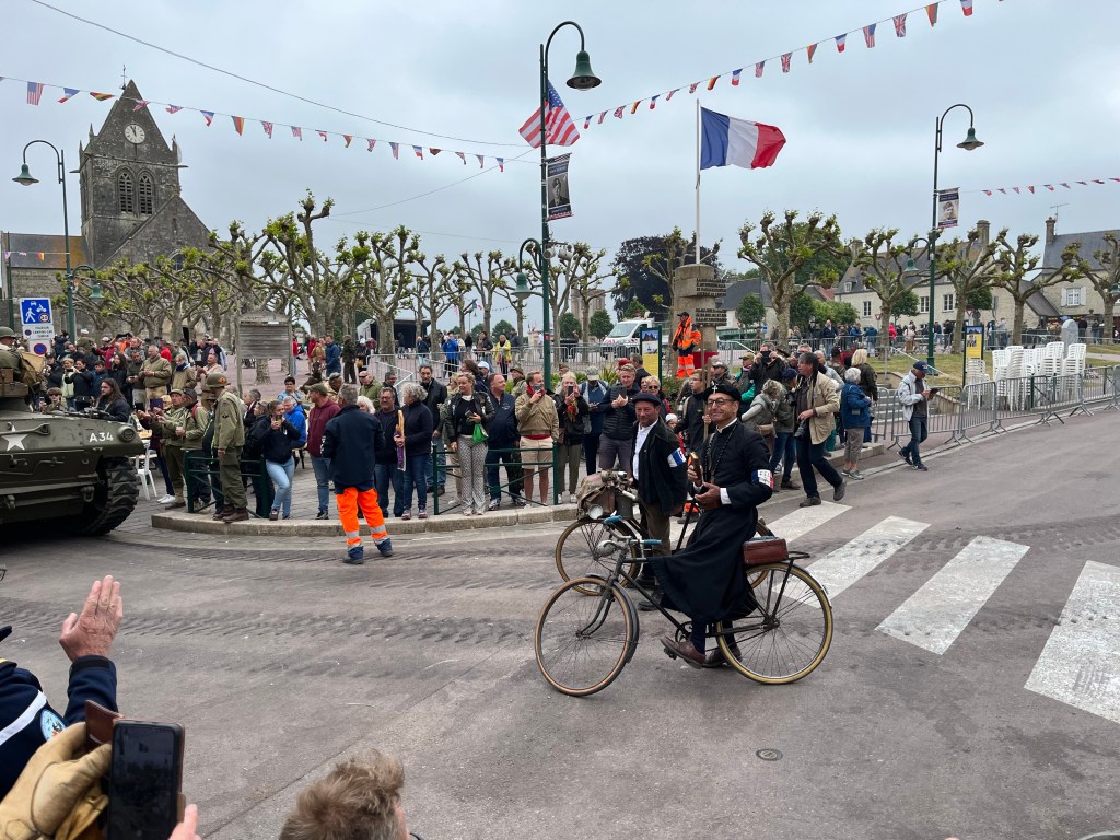 We arrived just as a parade of American tanks and military vehicles accompanied by members of the ‘local Resistance and the town’s Priest’ make their way around the square. The town is full of military reenactors from around Europe plus serving British, American & French serving military who are taking part in the Commemorations.