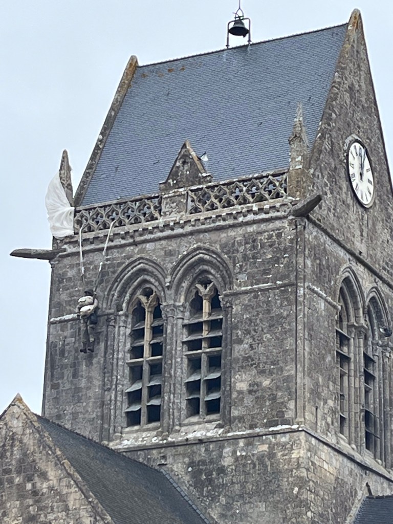 In Sainte Mere, a house in the centre of town caught fire in early hours, the townspeople were allowed to assist in putting out the fire under the eyes of the German soldiers stationed in the town. Mistakenly the paratroopers were dropped right above the town and as they drifted into view were either shot or captured by the Germans, one paratrooper drooped straight into the fire whilst another, John Steele, onto the church tower where his parachute became entangled and he ended up hanging precariously above the town. Although he played dead for a couple of hours he was eventually cutdown and taken prisoner but later escaped. The town is eventually taken by the Americans by 6 am. Today an effigy complete with parachute hangs from the church tower as a reminder of that night.