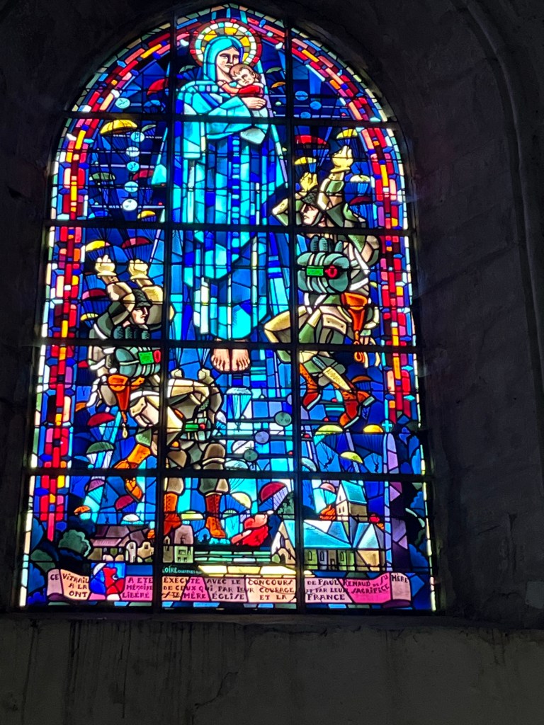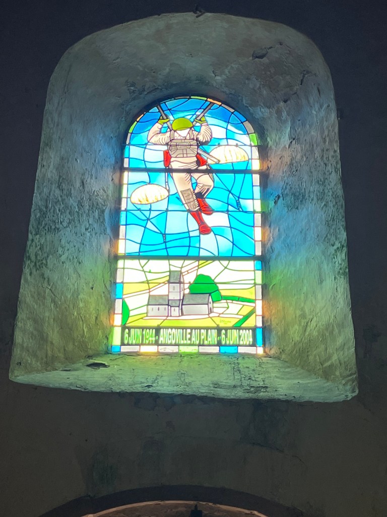 The Church suffered some war damage, when an American tank accidentally blew the front doors off and a mortar crashed through the roof but luckily did not explode. The Church, as with the Church in Sante Mere Eglise replaced its shattered stained glass windows with those commemorating their Liberation.