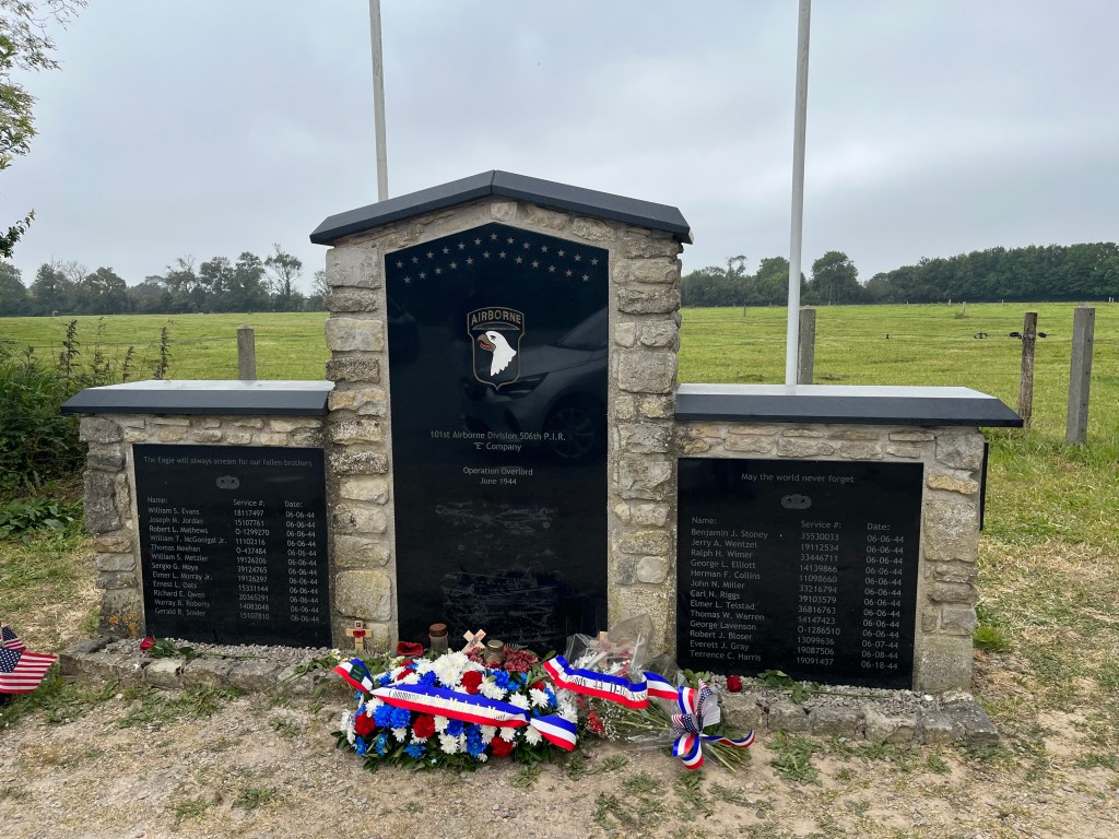 At the Memorial we met a group of ex-Royal Marines who were on a motorbike tour of the Normandy Battlefields. Just down the road, is the Memorial to Easy ‘E’ Company of the 101st Airborne which Winters led. On 6th June Dick Winters and a team of 12 men destroyed a German Artillery Battery which had been firing on forces exiting Utah Beach. In one of the gun positions a German map containing all artillery and machine gun positions in the Cotentin Peninsula area was discovered. This information was passed up the chain of command.