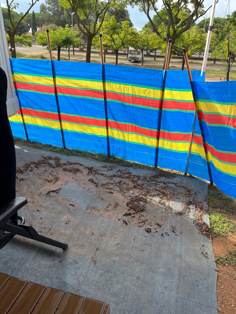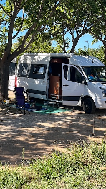 We arrived at our beachside camp, late in the afternoon. We had stayed at this basic campsite 2 years previously. It is basically a car park that offers electric hook up, water and waste facilities but the beach is just across the road. You can hear the sea from your bed and there are several restaurants and a good shop and bakery on the doorstep. By half 4, we were on the beach in time for a swim in the relatively choppy sea and to catch the last of the sun. The wind was getting up and the site manager came round to tell everyone to tie awnings down or take them in as strong winds and torrential rain were expected overnight and into Wednesday…