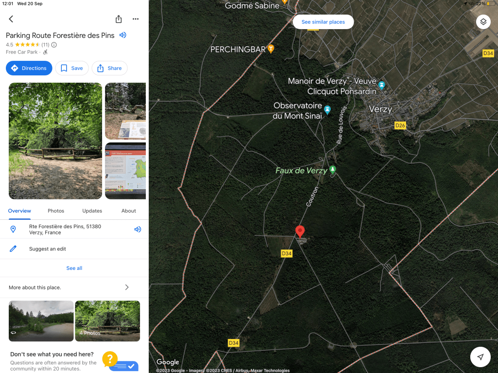 Having got a late tunnel crossing on Saturday afternoon, we blasted down the toll road to just outside of Reims, champagne-central. Our aim was to get to our overnight stop before it got too dark. Charlie had found a car park in the middle of a forest, located above Verzy and its many vineyards.