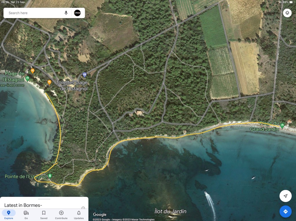 We decide to explore the coast further west and picked a spot called Pointe de l’Estagnol, which has a beachside restaurant and there seemed to be some coastal footpaths winding through the pine forest.