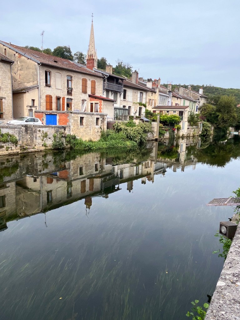 As we had had no breakfast, we decided Joinville was an ideal lunch spot. The motorhome, now with a trailer, does not lend itself to squeezing into a parking space. On the other side of town we found a riverside car park with space for us. Most French towns provide parking and overnight stops for camper vans and motorhomes. We wandered back into the town centre along the River Marne and managed to get the last table at the only restaurant open in town, (unless you wanted a pizza).