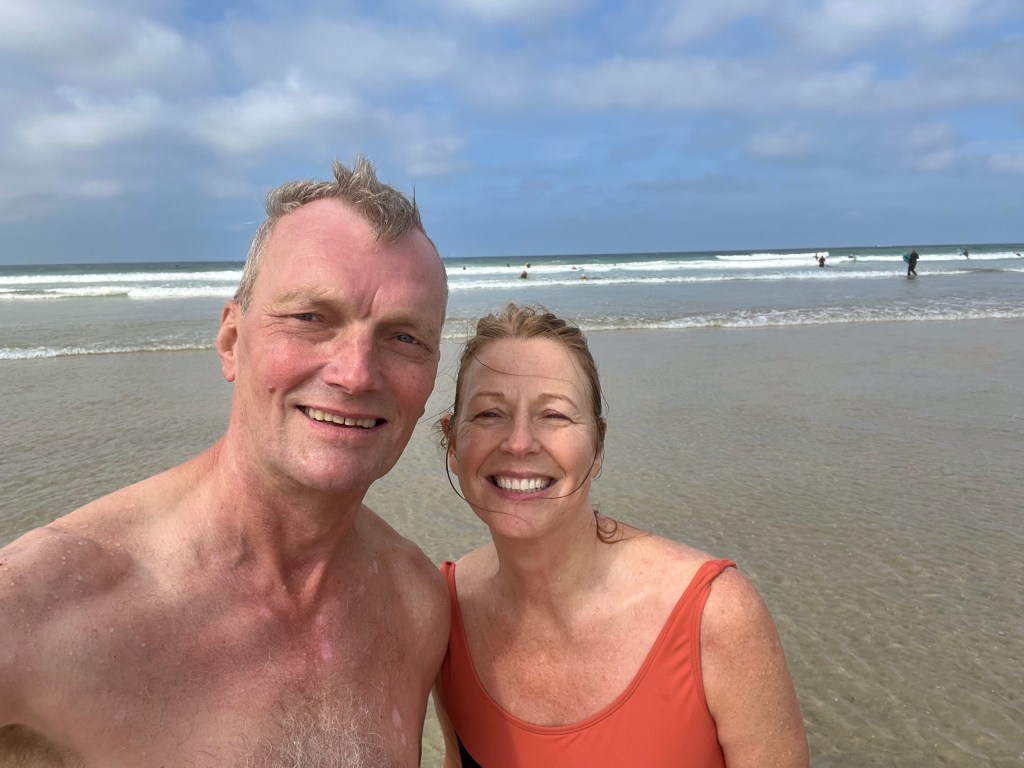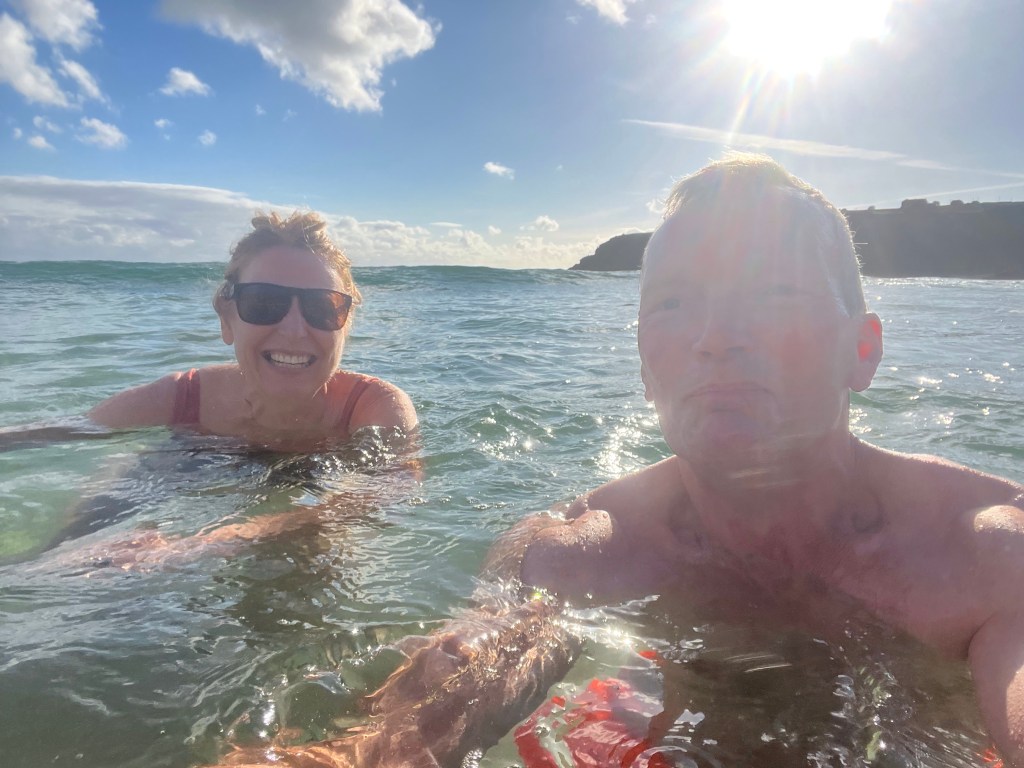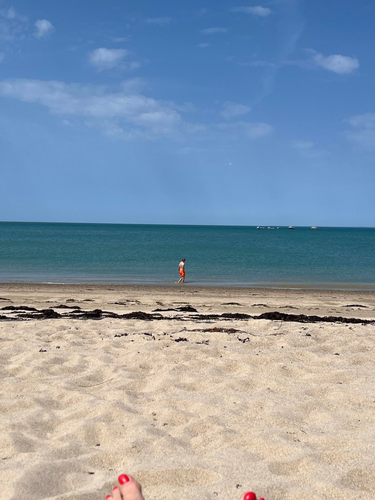 It was warm if you were out of the wind, we laid out towels out under the cliff protected from the wind and ventured again into the sea. This bay was calmer and although the water was bracing – 15 degrees – I could swim 4 ‘laps’ between the lifeguard flags which marked out 3/4 of the beach quite easily.