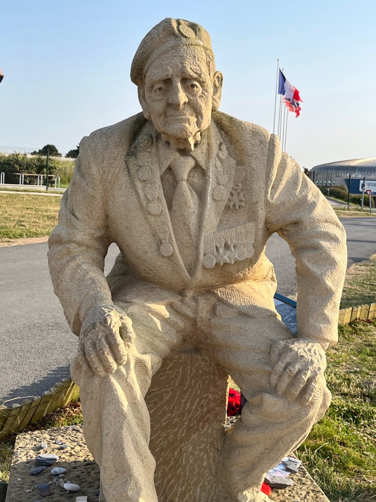 This stature depicts Bill Pendell looking out over the sea and at a artistic representation of him as a young man on the beach on D-Day.