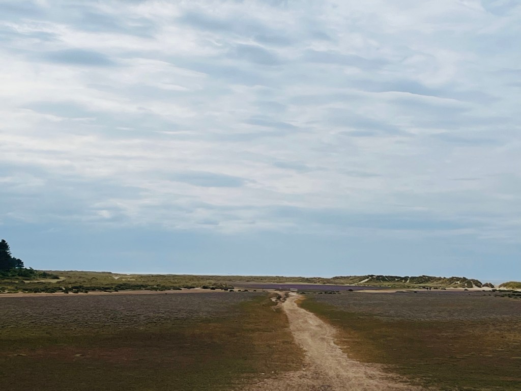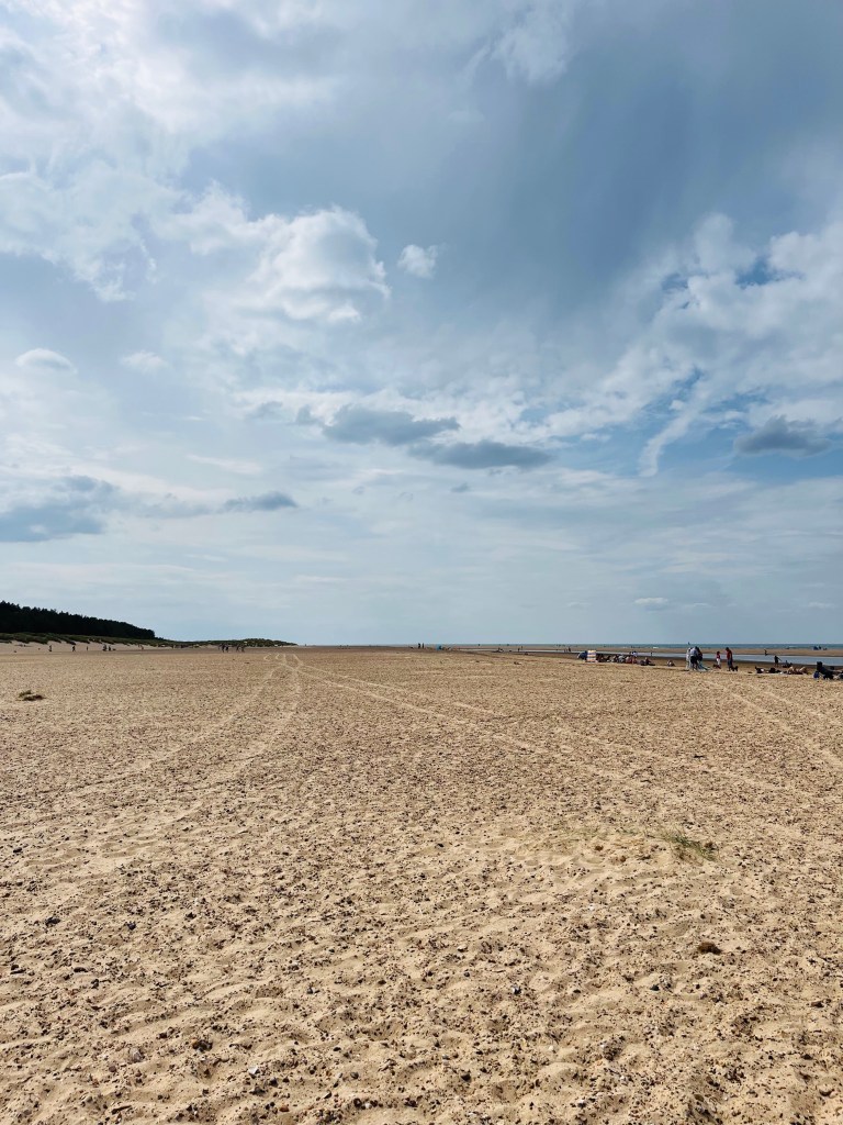 We returned to our bikes and cycled along the road to Holkham Beach. After navigating the boardwalk, we arrived at the ‘beach’, well we could see the beach in the far distance and the sea, well not in sight, yes, it was that far away!