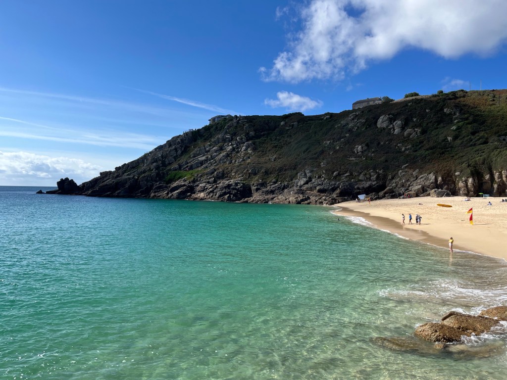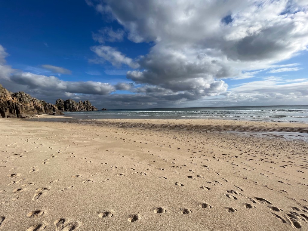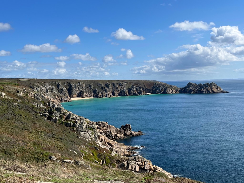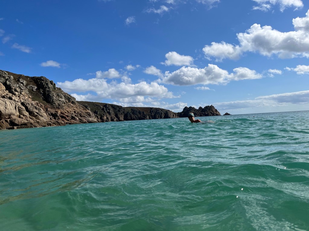 The outlook didn’t look good, we had packed a rucksack with a picnic and swim stuff for a walk along the Cornish Coastal path to just beyond the Minack Theatre, back through the village to Porthcuno Beach. Within a minute of starting the walk the heavens opened, one rogue cloud in a sky of white and blue. We briefly sheltered in the lee of the motorhome and as quickly as it arrived, it stopped raining.