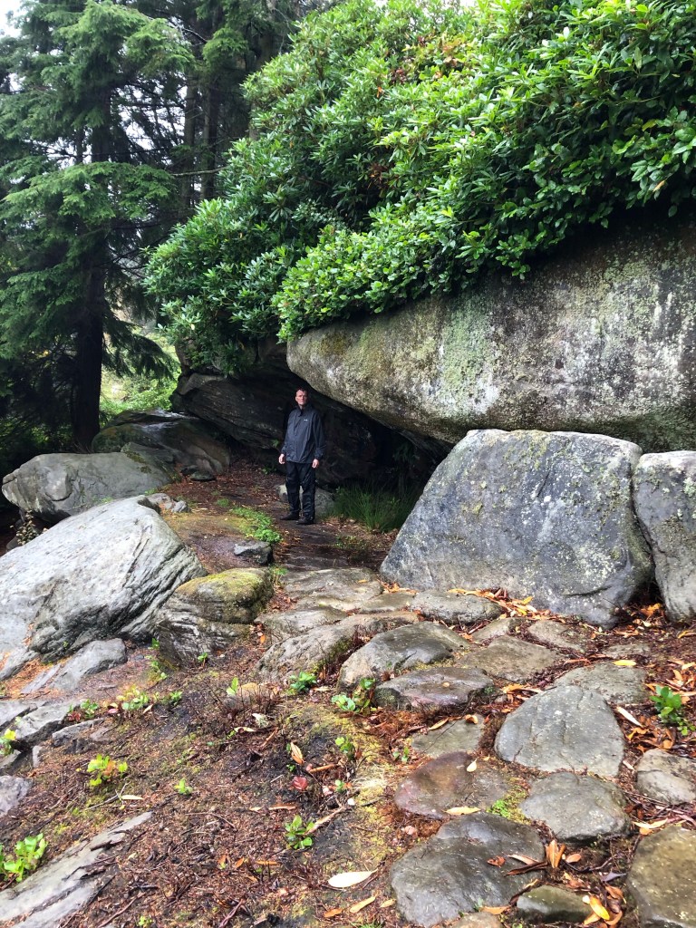 We explored the formal gardens, the Pinetum, the Archimedes Screw, the Pump Room, the Rock Garden, the Iron Bridge and the Power House. Cragside has over 30 miles of footpaths and has red squirrels, but we only covered 8 miles of paths and not a squirrel was spotted. However we did get wet, our waterproofs threw in the towel against the Northumbrian rain but still we walked. Cragside is built on and features sandstone rocks and escarpments, just like our sandstone outcrops around Tunbridge Wells, and their rock garden, one of the largest in Europe uses the sandstone to dramatic effect.