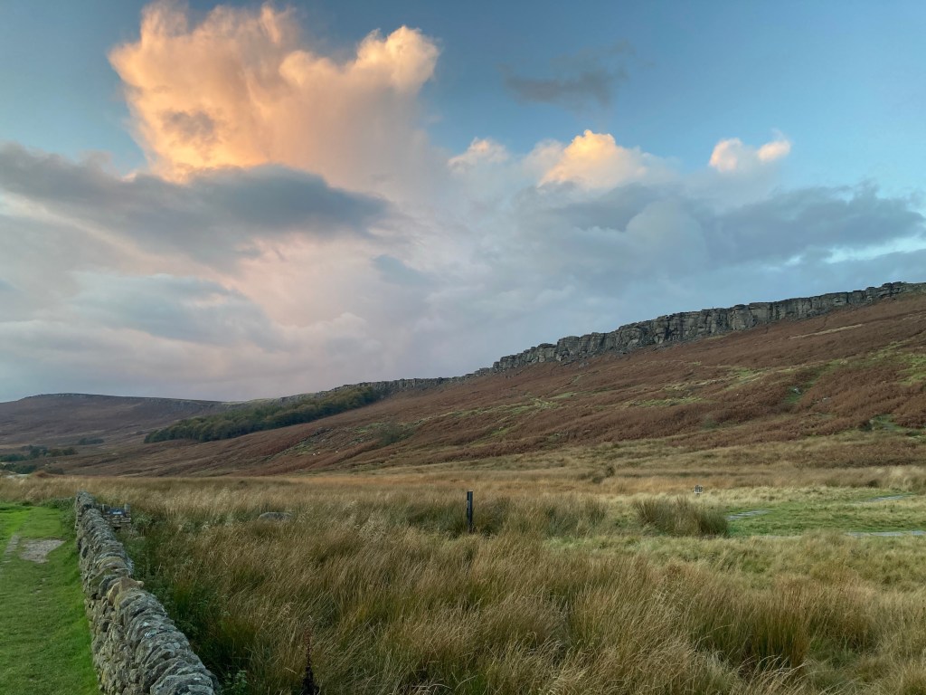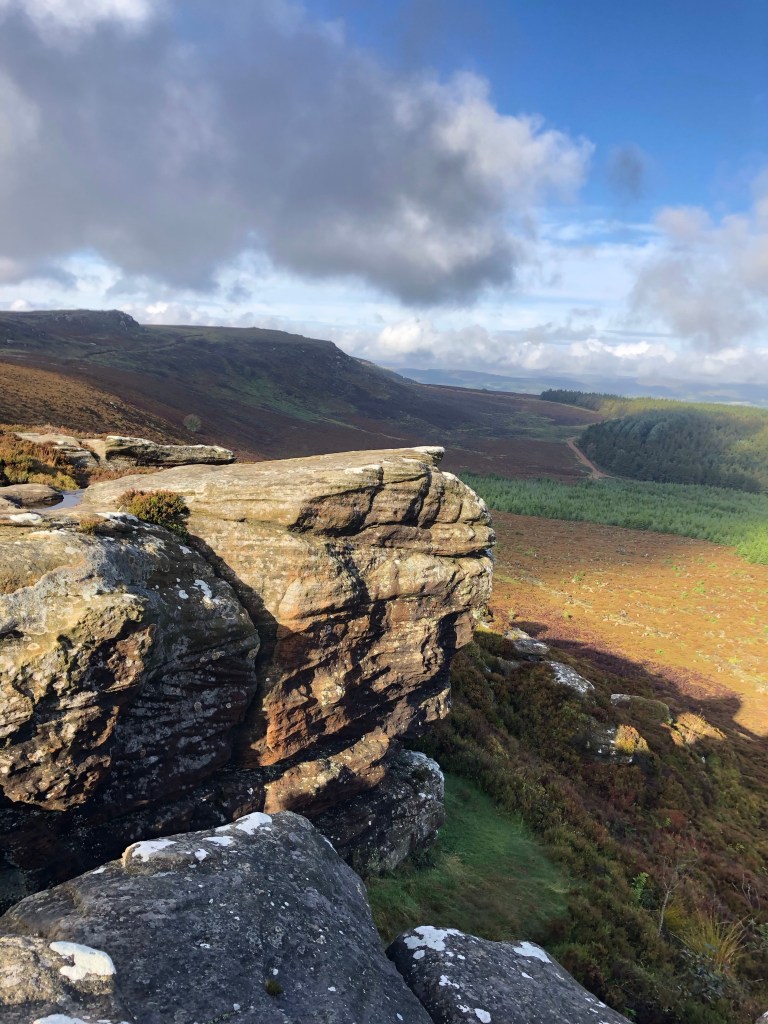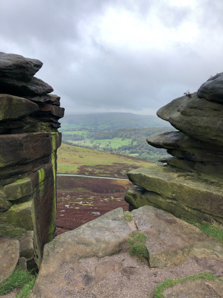 The next morning the rain had eased back to squally showers so we headed up Stanage to walk along the escarpment, where once a paved packhorse road ran, in search of Robin Hood’s cave, which we climbed down to. Gradually the rain cleared and by the time we were back at the van for breakfast, the weather was positively balmy..