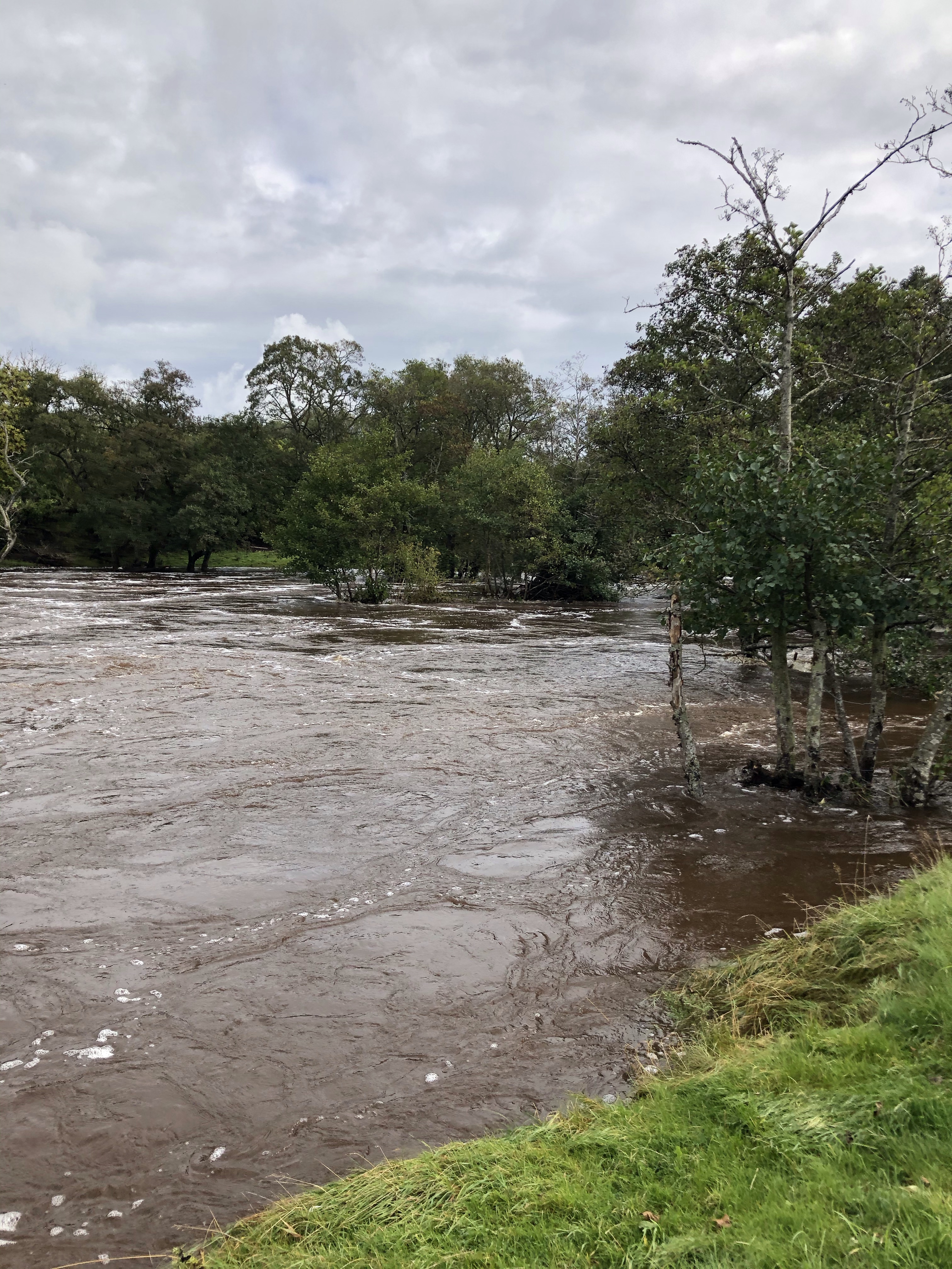 We had foregone breakfast as we had booked into a local pub for lunch, so after our appetite inducing walk, we returned to our camping spot. When we left for our walk, there was one other car, by the time we got back, the car park was packed. The sunshine had brought everyone out. So we headed down into the valley, driving through floodwater and came upon flooded fields and a raging river.