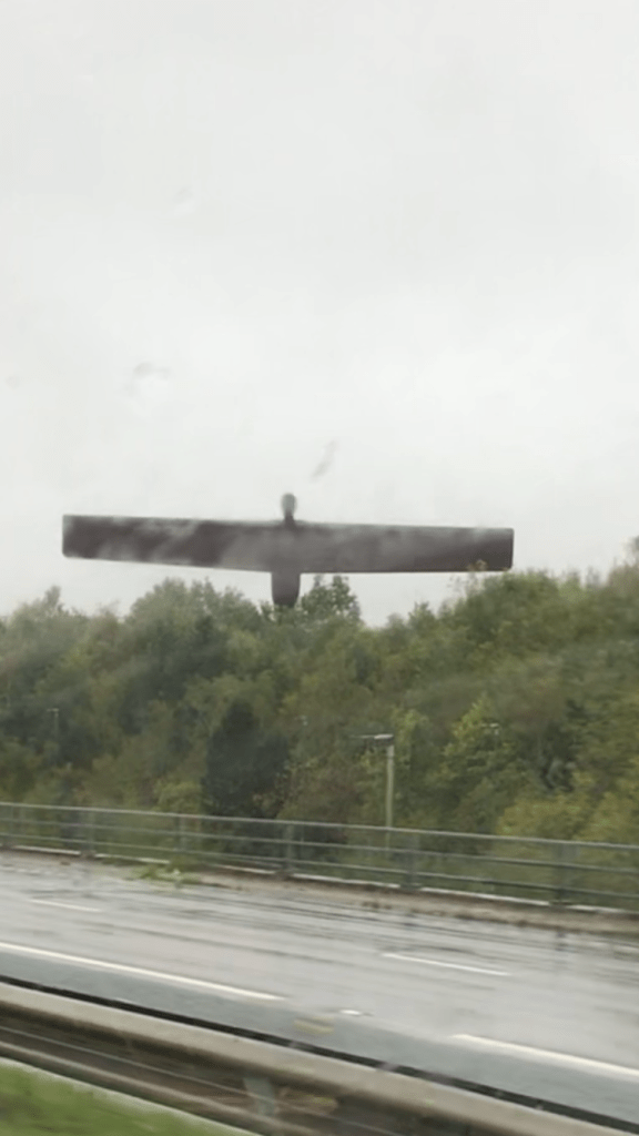 The weather can only be described as ‘grey to the ground’ with rain a constant, so the landscape was hardly visible beyond the roadside hedges, allowing my mind to wander freely until we saw the Angel – we are really North now! Have to say though, thought it would be more impressive, but Charlie said the trees had grown since the last time he drove past and it has diminished the impact.