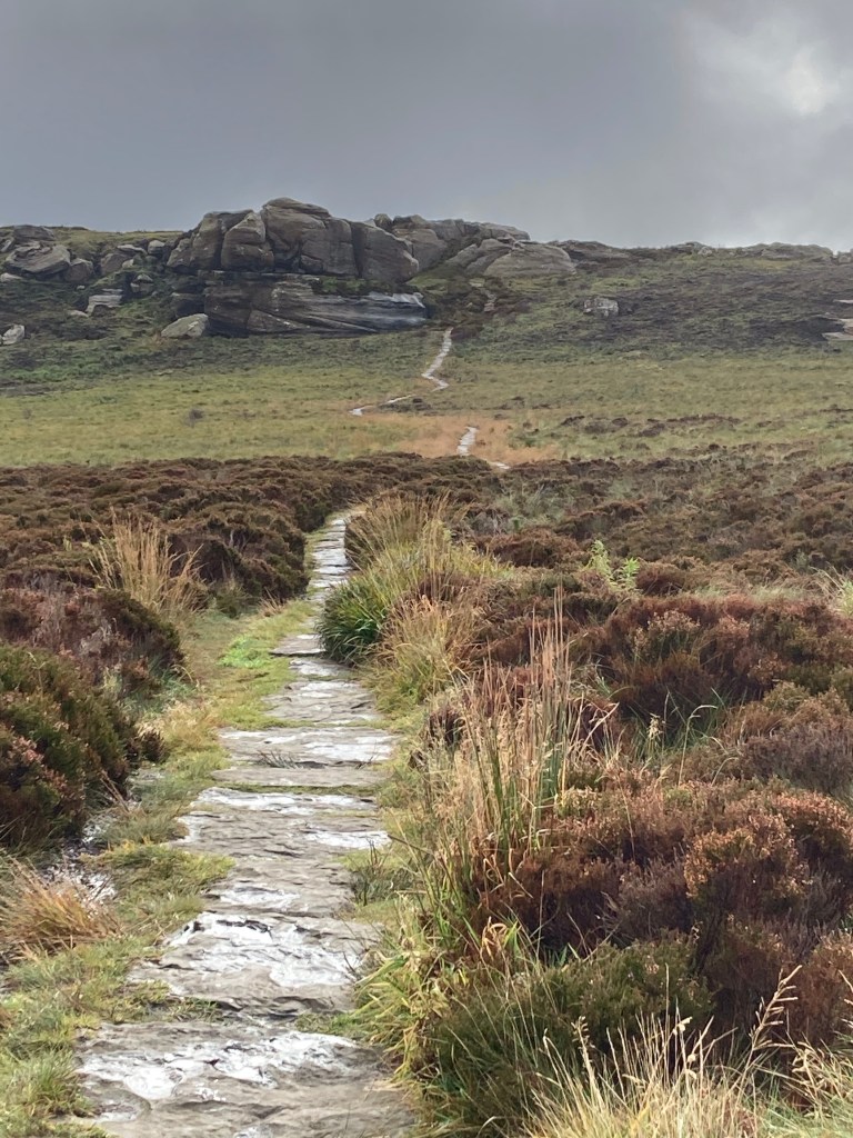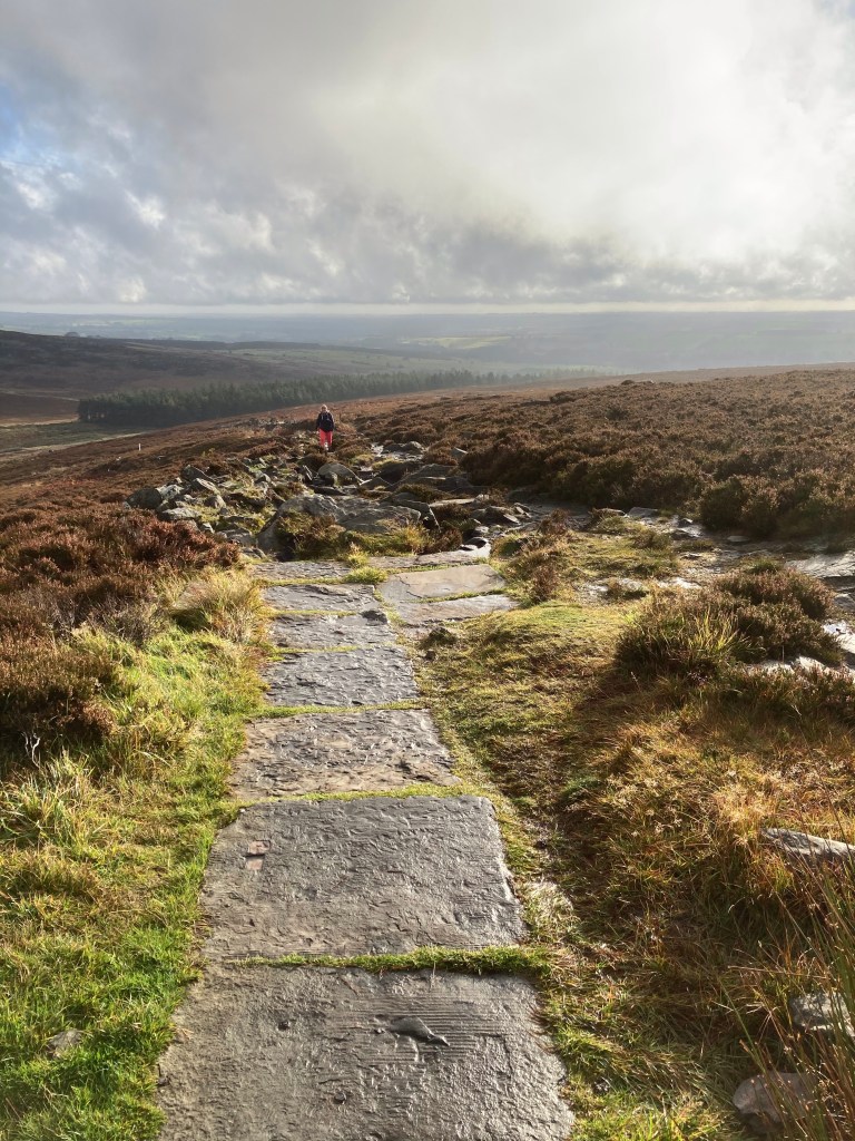The walk along the Simonside ridge was identified by a path laid with stone. We felt like Roman Centurions, walking and climbing up this path, that followed up to the ridge, then down through the peat bogs and back up to the ridge.